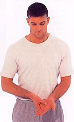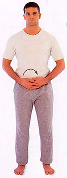 Stand straight with your knees slightly bent. Place one hand just below your navel, with the other on top. Move them around slowly in a large clockwise circle. Repeat this a few times in the same direction then rest your hands in their original position.