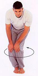 Stand with your feet together. Bend your knees and place your hands on top of them. Rotate your knees in a semicircle, straightening your legs as you bring your weight backward. Repeat, then rotate twice in the opposite direction.