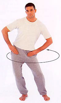 Place your hands on your hips and move your feet apart. Bend your knees and slowly rotate your hips in a complete circle. Relax into each position and feel yourself stretching the front of your thighs, hips and lower back. Repeat in the opposite direction.