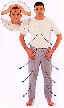 Shake your hands, then stroke them up over your forehead and the top of your head, down to your neck and across your face. Work down your arms, hands, chest and abdomen, back and buttocks, then legs and feet, as if brushing dust off your clothes.