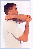 Make a loose fist with your right hand. Bring it up to your shoulder, supporting the elbow with your other hand. Bounce the fist along the top and back of your shoulder. Change hands and repeat on the other side